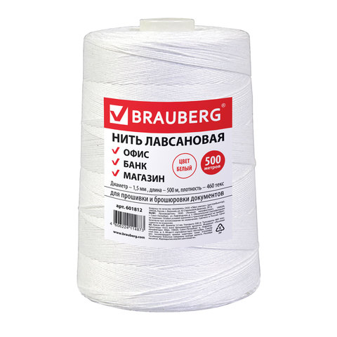 Нить лавсановая для прошивки документов BRAUBERG диаметр 1 мм длина 1000 м, ЛШ 210 белая, 601578