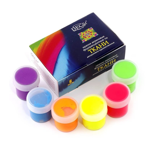 Акриловые краски по ткани 6 цв, DecArt, флуоресцентные картонная коробка, 8079635