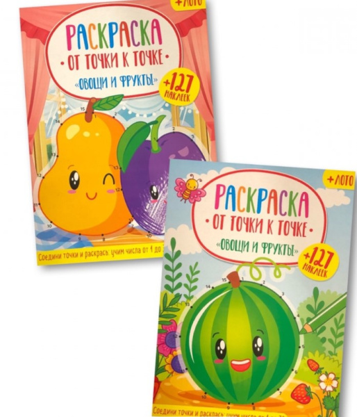 —Раскраска А4 Полипринт 'Овощи и фрукты', от точки к точке, с цветным фоном, с наклейками, 29046